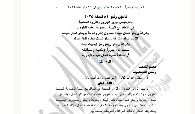 أصدر الرئيس عبد الفتاح السيسي القانون رقم 81 لسنة 2025، عقب موافقة مجلس النواب المصري، والذي يتضمن الترخيص لوزير البترول والثروة المعدنية بإبرام تعاقد جديد مع الهيئة المصرية العامة للبترول وتحالف شركة برينكو، بهدف تنفيذ أعمال البحث عن البترول وتنميته واستغلاله في منطقة تنمية شمال سيناء البحرية.