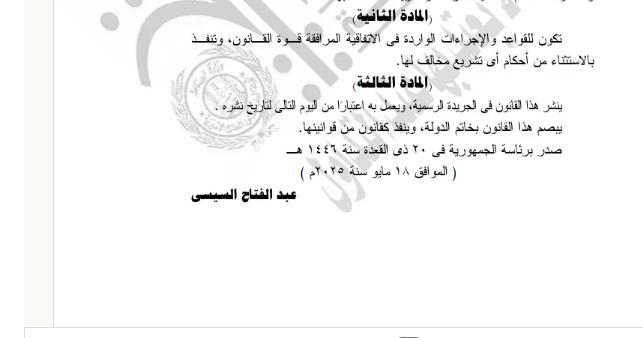 نص القانون على أن القواعد والإجراءات الواردة في الاتفاقية المرفقة تُعد ذات قوة قانونية ملزمة، ويتم العمل بها بما يعلو على أي تشريع آخر قد يتعارض معها.