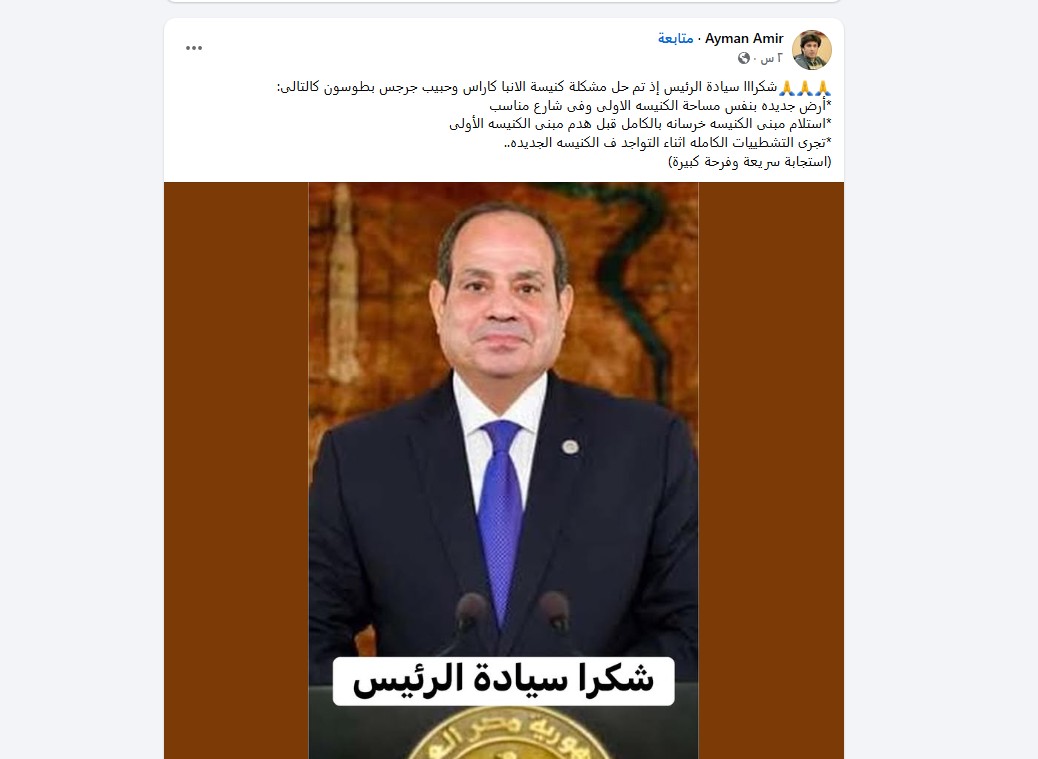 أنباء عن حل أزمة كنيسة الأنبا كاراس بطوسون بتدخل رئاسي وتخصيص أرض بديلة قبل الهدم