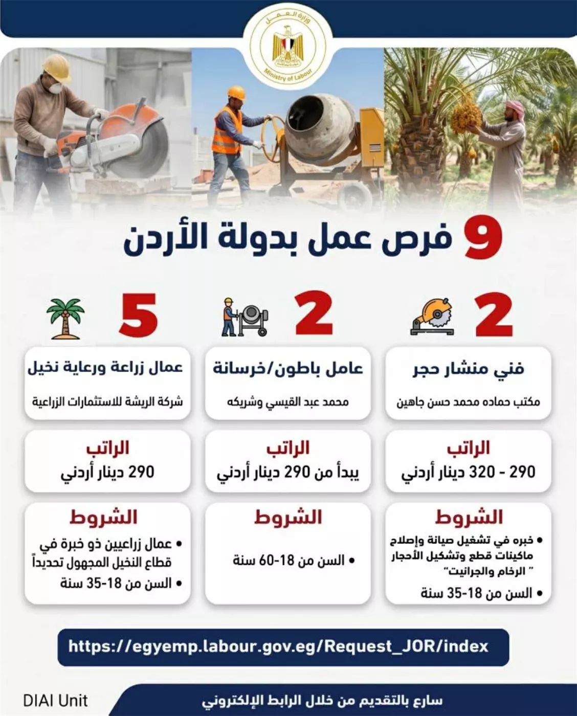 أعلنت وزارة العمل المصرية عن إتاحة مجموعة وظائف للمصريين داخل الأردن، وذلك ضمن خطتها لدعم التشغيل الخارجي وتوفير فرص دخل مناسبة للراغبين في العمل خارج البلاد خلال عام 2026.