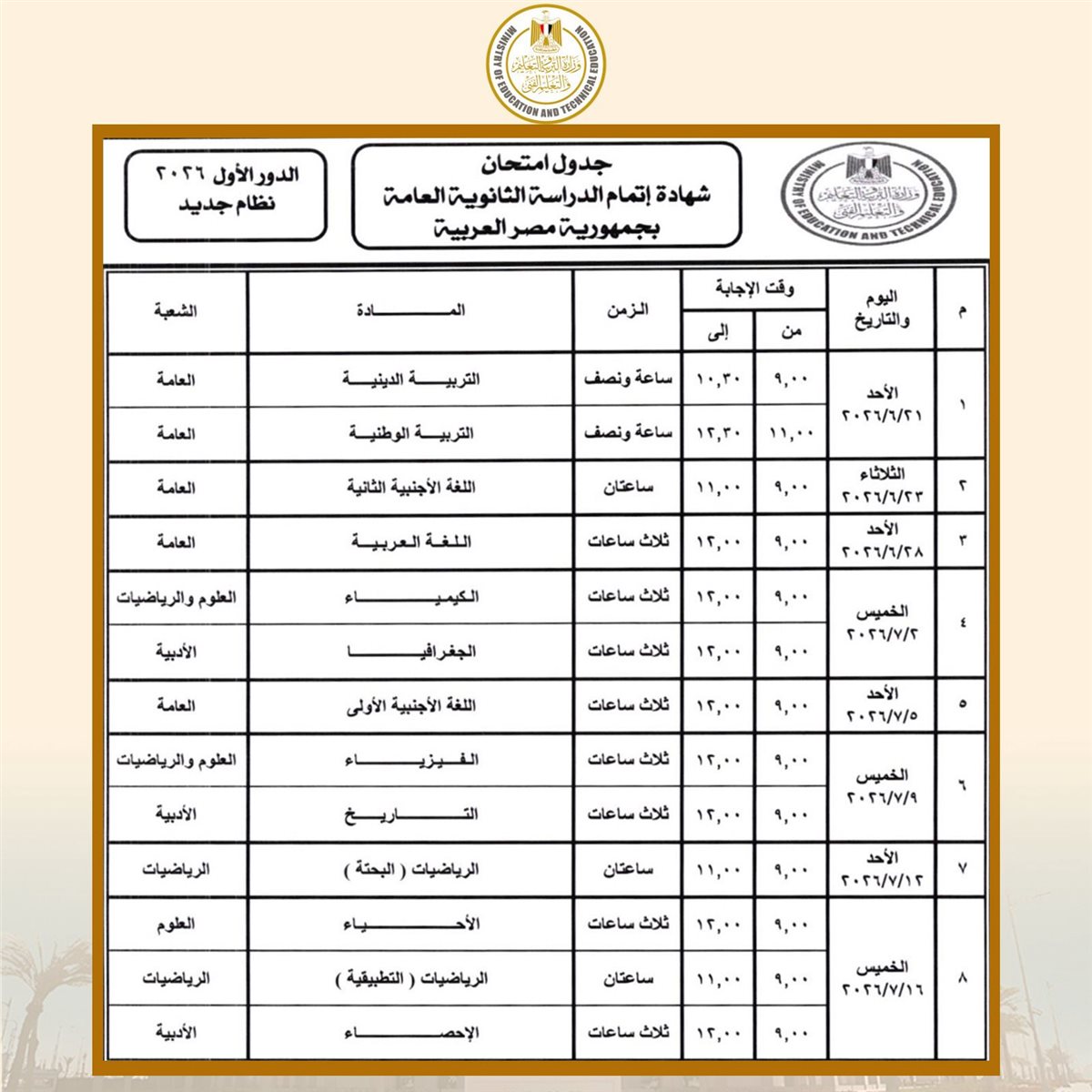 جاء جدول امتحانات الثانوية العامة 2026 وفق الخطة الرسمية التي أعلنتها الوزارة كالتالي: