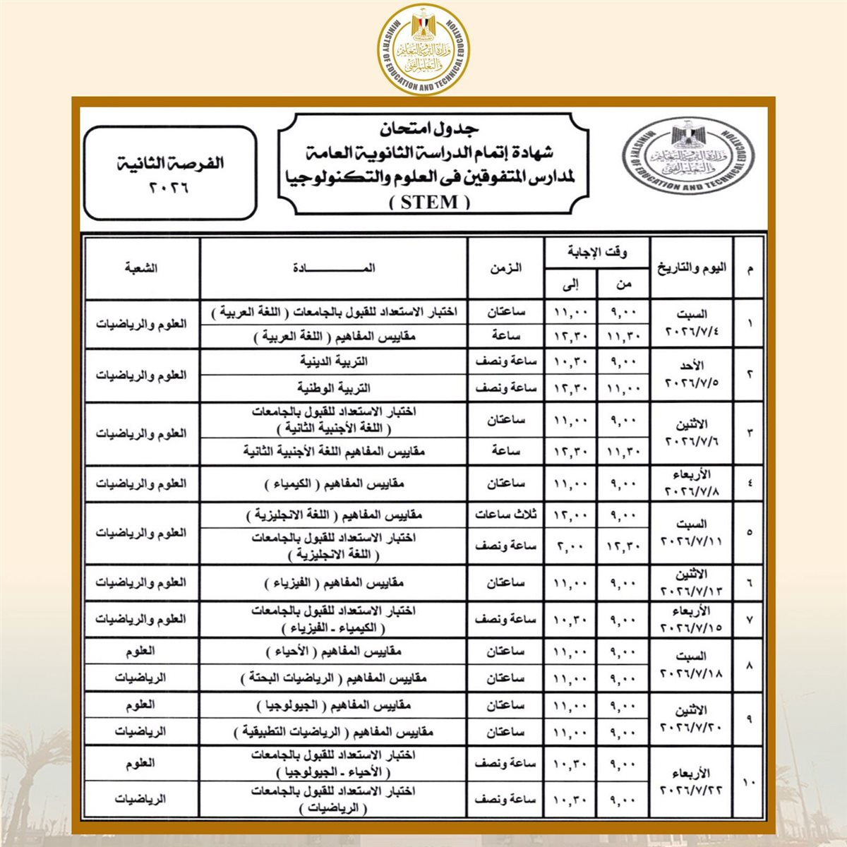 أما طلاب مدارس المتفوقين في العلوم والتكنولوجيا، فتبدأ امتحاناتهم (الفرصة الأولى) يوم 16 مايو 2026 وتنتهي في 20 يونيو 2026، بينما تنطلق امتحانات الفرصة الثانية يوم 4 يوليو 2026 حتى 22 يوليو 2026.