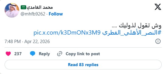 وجاء هذا التفاعل الكبير عقب نشر صورة للاعب النصر عبدالله الحمدان، مرفقة بتعليق مقتضب قال فيه الغامدي: “وش تقول لذوليك”، وهو ما فتح الباب أمام تفسيرات وتساؤلات واسعة من الجمهور.