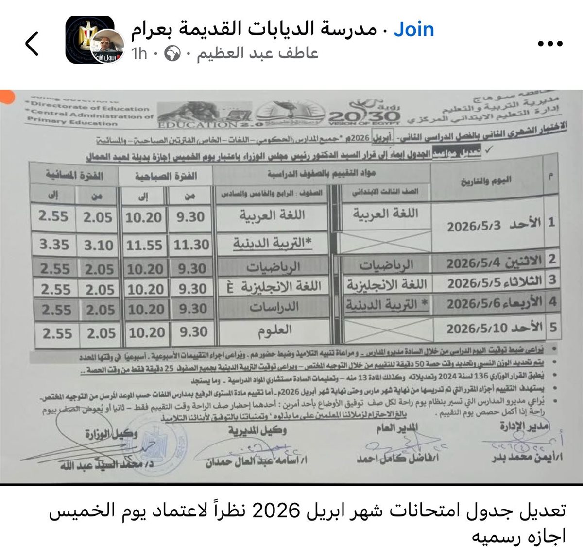 بدأت مدارس محافظة سوهاج بالفعل تطبيق تعديل جدول امتحانات شهر أبريل 2026، حيث تم إلغاء امتحانات يوم 7 مايو، مع توقع إعلان باقي المحافظات جداولها المعدلة خلال الساعات المقبلة.
