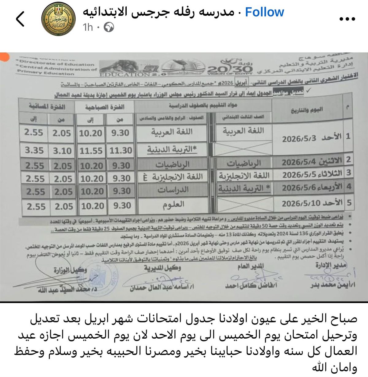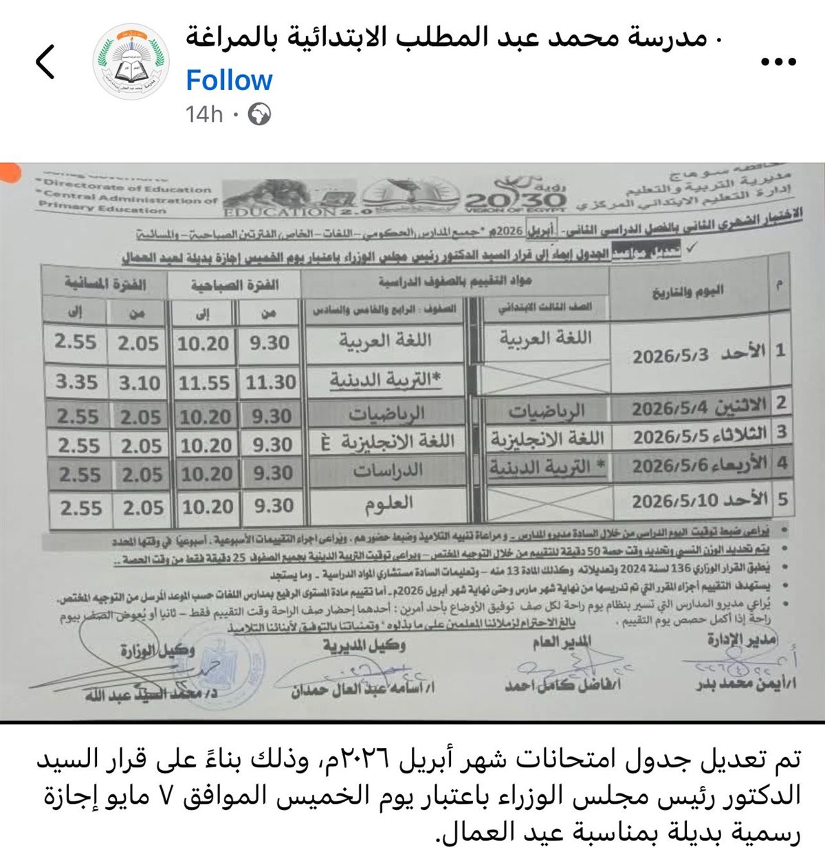 تعديل جدول امتحانات شهر أبريل 2026 رسمياً بعد قرار الحكومة بإجازة عيد العمال وتأجيل الاختبارات