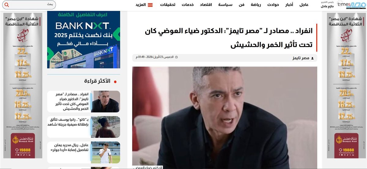 تحليلات جديدة حول وفاة ضياء العوضي: الطب الشرعي يكشف عن تعاطي الكحول والمخدرات وفقا لمصادر اخبارية