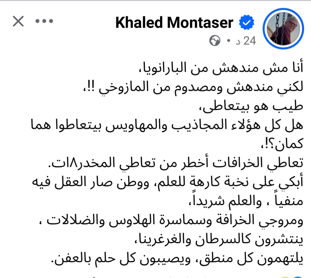 وفي منشور له عبر وسائل التواصل، انتقد ما اعتبره انتشارًا واسعًا للتفكير غير العلمي، مؤكدًا أن مواجهة الخرافة أخطر – من وجهة نظره – من الوقوع في الخطأ الطبي أو المعلوماتي.