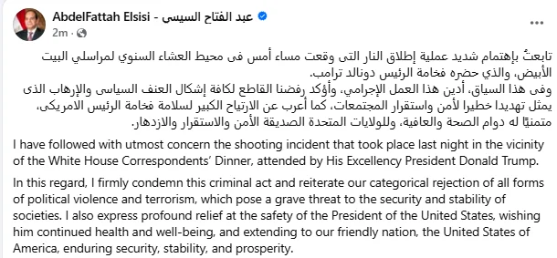 الرئيس السيسي .. في أعقاب حادث إطلاق النار الذي أثار حالة من القلق في الولايات المتحدة، حرصت مصر على التعبير عن موقفها الرسمي سريعًا، حيث أكدت القيادة السياسية متابعتها الدقيقة لتفاصيل الواقعة التي حدثت بالقرب من فعالية إعلامية بارزة حضرها كبار المسؤولين.