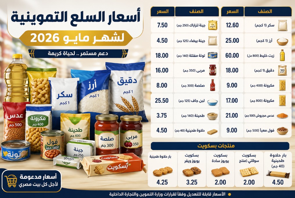 نشر قائمة أسعار السلع التموينية لشهر مايو 2026 مع استقرار أغلب السلع وزيادات محدودة